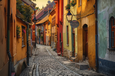 Cobblestone road winding through old European village with historic architecture, A cobblestone road winding through historic architecture