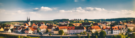 Panorama of a small old European town, many small houses, tilt-shift effect