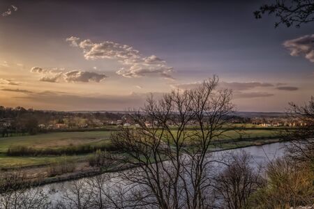 Sunset in the city of Znojmo in the South Moravian region in the Czech Republic. View of the castle and dam and vines on the hillside. Orange light illuminates the whole scenery.