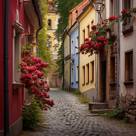 A picturesque narrow cobblestone street lined with colorful flower pots creates a charming atmosphere in a quaint European village. Bright blooms decorate the walls and pathways.