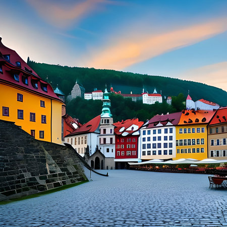 Charming cobblestone street lined with colorful houses with flowers leads to a castle on a hilltop in a historic european town