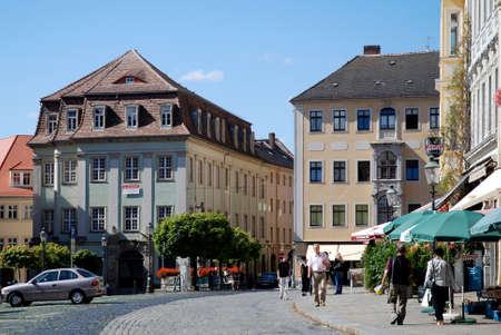 Pedestrians on the Market place at the Town hall of Zittau in Saxony - Germany.