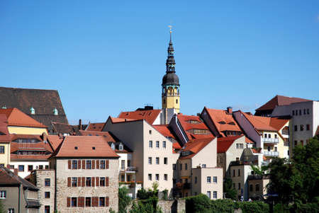 Roofs of houses in the old town and view on the Elbe river. Meissen. Germany.