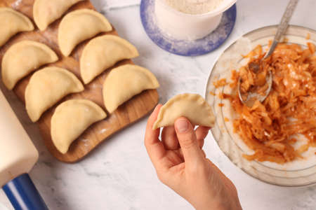 Cooking dumplings with cabbage at home, Traditional dish of Ukrainian cuisine, The dough in female hands, Top view