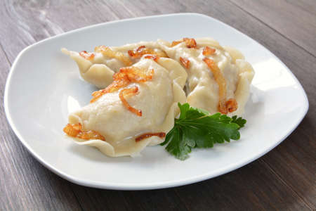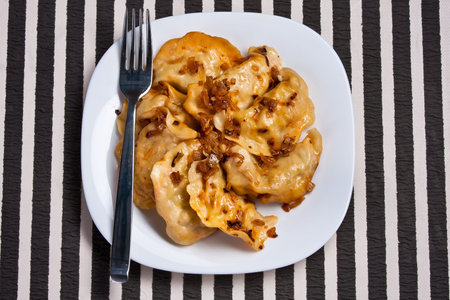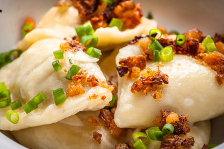 Close up of dumplings sprinkled with fried onion, traditional Polish, Russian and Ukrainian cuisine, tasty dish