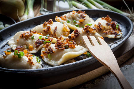 Tasty, homemade dumplings with onion and bacon in a metal bowl. Selective focus.