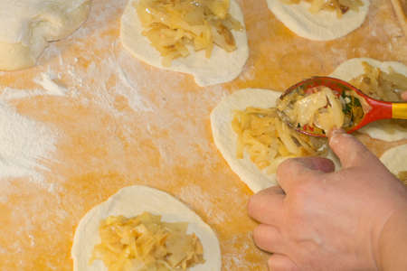 Raw dumpling with potatoes. Preparation dumplings on a wooden board. Top views, close-up.