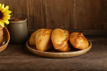 pierogi .Home cake with jam against the wooden table