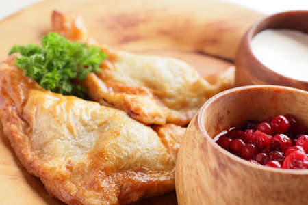 meat pie with sour cream and cranberries on wooden plate