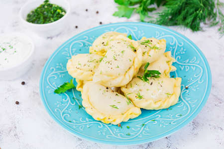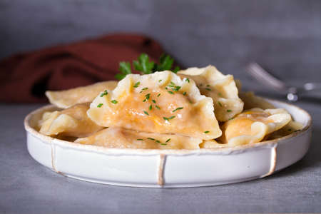 Dumplings, filled with mashed potatoes. Russian, Ukrainian or Polish dish: varenyky, vareniki, pierogi, pyrohy.