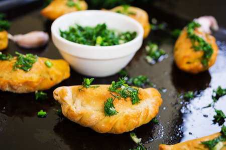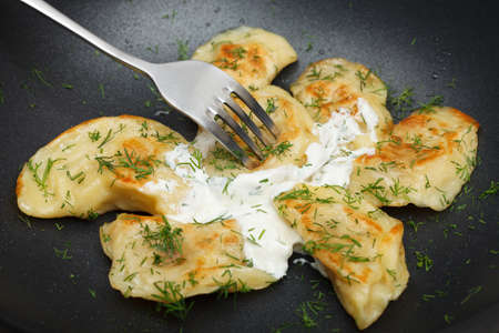Fried dumplings with fresh dill and sour cream. Cooked dish taste concept
