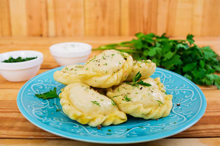 Dumplings stuffed stewed cabbage and sour cream. Traditional Ukrainian dish varenyky. Healthy vegan (vegetarian) food. Old blue wooden background