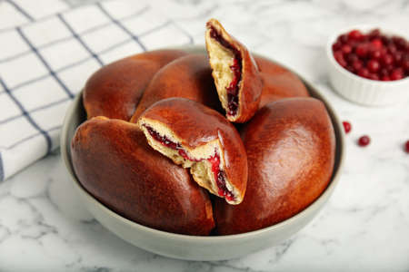 Delicious baked cranberry pirozhki in bowl on white marble table