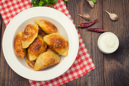 Fried dumplings. Wooden background Top view. Close-up