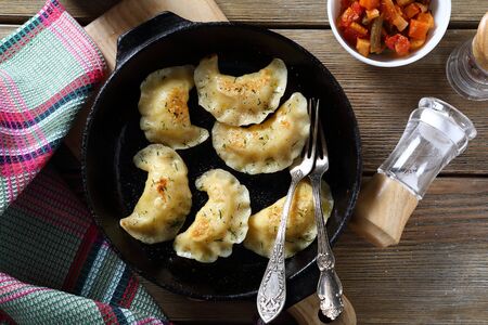 dumplings fried in a pan. popular and tasty food in Poland