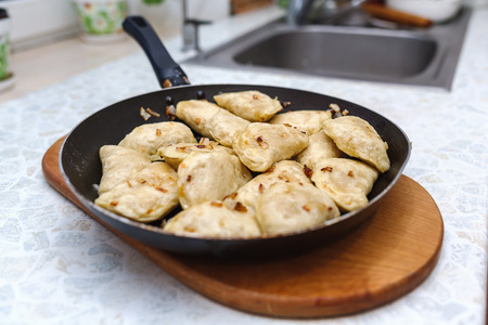 Ukrainian traditional dish with boiled dough with onion fries on a frying pan. Closeup view.