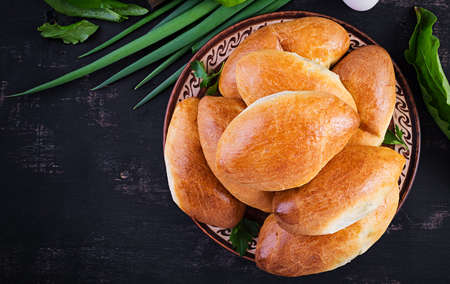 Traditional Ukrainian pies with eggs, green onion, sorrel on dark background. Russian piroshki, homemade baked patties. Top view, above, copy space