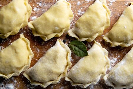 Prepared for cooking vareniki, dumplings, pierogi on a floured wooden board - traditional Ukrainian food. Selective focus