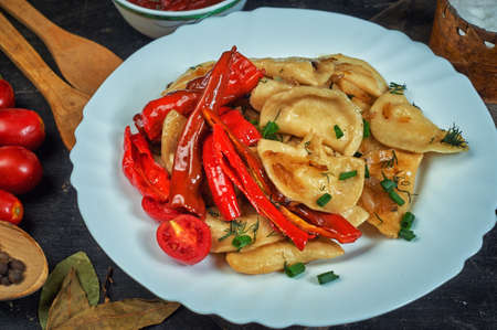Fried dumplings with hot pepper and onion on a plate .the view from the top