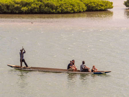 Fadiouth, Senegal, AFRICA - April 26, 2019: Unidentified Senegalese Men man rides a typical wooden canoe in a sea lagoon and fishes. Behind him are the green mangroves. It is sunny day.