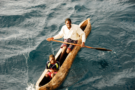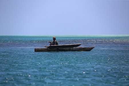 Ifaty, Madagascar, June 16, 2017: Malagasy fisherman of Vezo ethnicity group in his little outrigger canoe in Ifaty lagoon, South-West of Madagascar