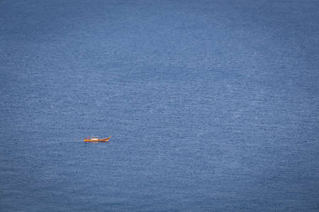 Top view of a fishing boat sailing on the blue ocean with small wave on the surface of the ocean water