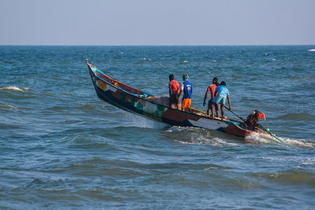 Indian fishermen on the boat, Mamallapuram, Tamil Nadu, India.