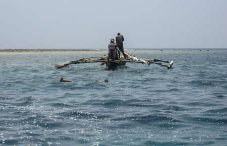 Fishing ship with local fishermans in water of Indian ocean. Zanzibar, Tanzania.