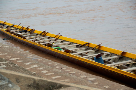 Empty wooden boat on the side of a river in a south asian Village during the rainy season.Asian wooden boat