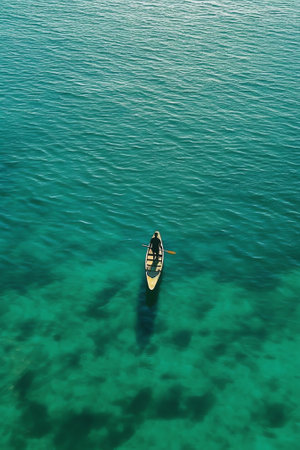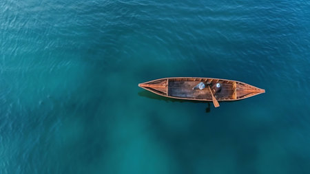 Aerial view of rowing boat gliding through deep blue water, showcasing vibrant contrast between boat and ocean. scene evokes sense of tranquility and teamwork