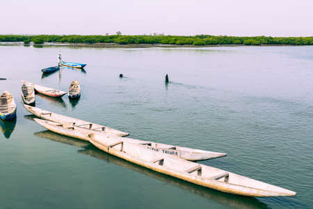 JOAL-FADIOUTH, SENEGAL - NOVEMBER15, 2019: Fishers and small long boats. Fadiauth Island. Senegal. West Africa.