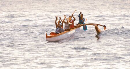 Rio de Janeiro, Brazil - August 17 2013: Group of women paddling outrigger canoes in the see. Photo taken in Red beach, next to the sugarloaf mountain.