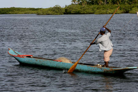 camamu, bahia / brazil - january 10, 2012: fisherman is seen paddling his canoe in Baia de Camamu, in the municipality of Camamu, in southern Bahia.