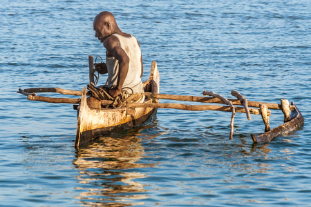 Unidentified man sails in traditional boat on lake Malawi on August 17, 2009 in Chilumba, Malawi