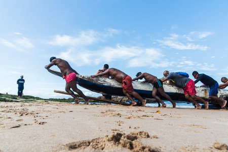 Salvador, Bahia, Brazil - May 23, 2021: Fishermen removing their canoe from the sea to place in the Boca do Rio fishermen colony.