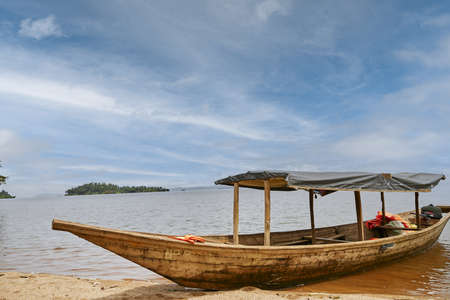 MADAGASCAR OCTOBER 18.2016 Malagasy people transport freight by traditional handmade dugout wooden boat using a perch. Daily life on the river. Maroantsetra October 18. 2016, Madagascar.