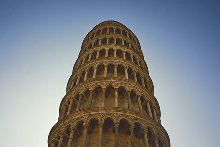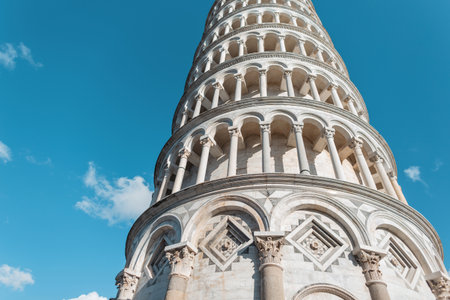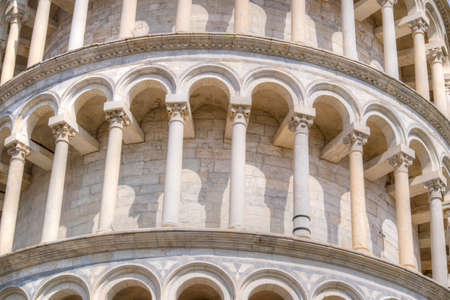 Amazing Romanesque architecture of the tower with columns on a blue sky background in the European city of Pisa, Italy