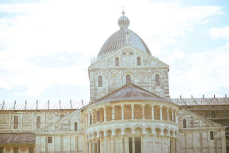 Beautiful Romanesque architecture facade of a cathedral in the European city of Pisa, Italy. Amazing ancient building on a sunny day with clouds