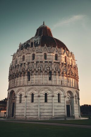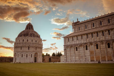 Pisa Piazza dei Miracoli with church dome in Italy at sunset