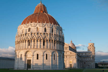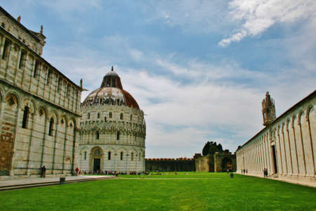 PISA - August, 4, 2020: landscape with Baptistery of San Giovanni and Pisa Cathedral in Pisa, Italy.