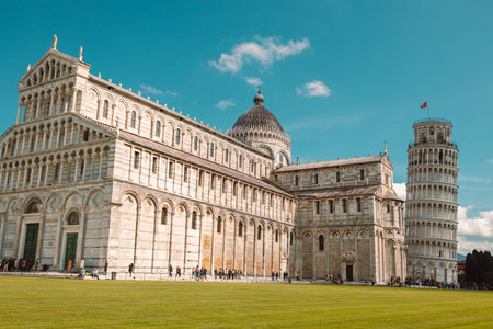 Pisa, Italy - March 18, 2023: Pisa Cathedral Complex, (Piazza del Duomo) and Leaning Tower of Pisa, outstanding medieval Christian architecture. High quality photo