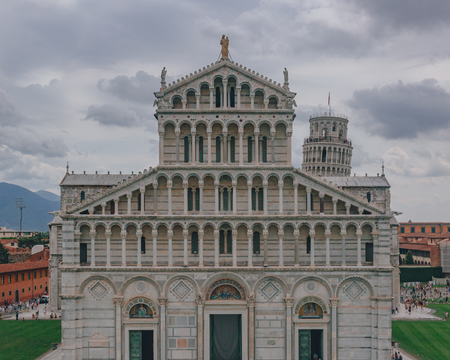 Direct frontal view of the facade of the Pisa Cathedral with the Leaning Tower of Pisa in the back, in Pisa, Italy
