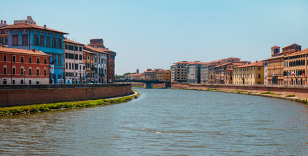 Pisa, Italy - June 26, 2025: The Arno River curves gently through central Pisa, bordered on the left by Lungarno Gambacorti and on the right by Lungarno Pacinotti, under a clear summer sky