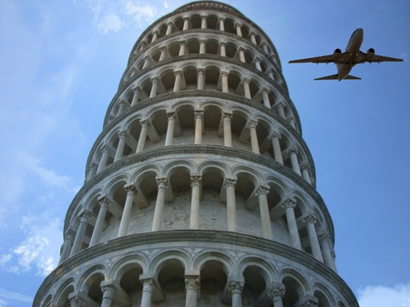 A metaphorical tourism image depicting an aeroplane flying past the leaning tower of Pisa, in Italy.