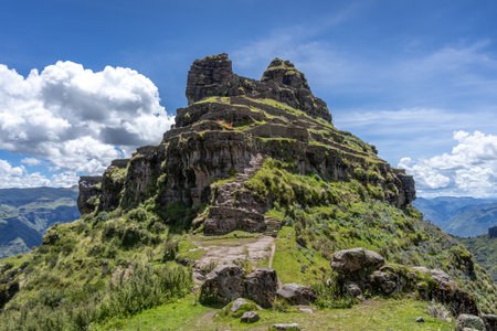 The archaeological site of Waqrapukara in Peru features terraced stone ruins on a rugged mountain peak, offering stunning views of the surrounding Andean landscape