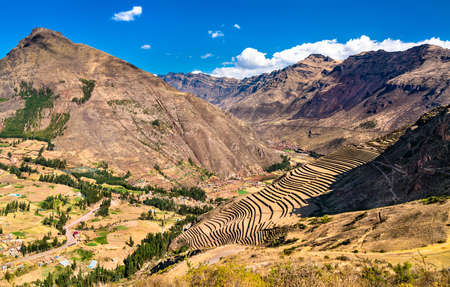 Inca fortress ruins Pisaq in Urubamba river Sacred Valley, Peru, South America.