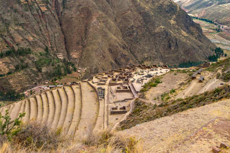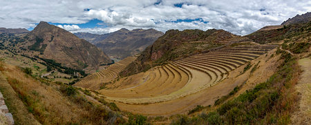 Panoramic view of the ancient Inca ruins of Pisac in the Sacred Valley near Cusco, Peru.