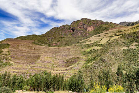 Mountainous landscape with semi-circular Inca agricultural terraces with a blue sky with white clouds