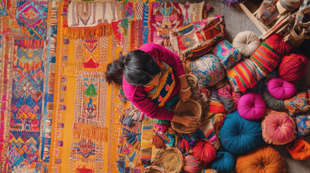A skilled artisan engages in traditional textile craftsmanship amidst a vibrant display of colorful threads and handwoven fabrics, showcasing cultural heritage.