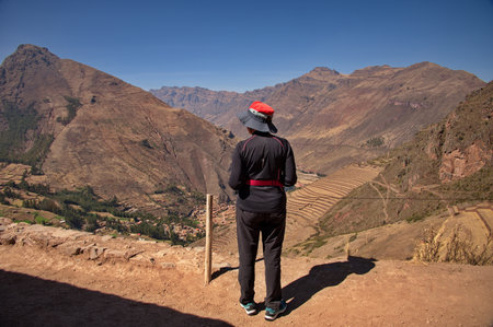 Rear view of woman standing on Pisac archaeological site with beautiful view on agricultural terraces